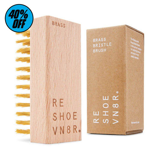 Once dry, the suede needs reviving. Vick brushes the uppers with a dry Medium Bristle Brush to restore the nap, then follows up with the Brass Bristle Brush for more detailed touchups in harder-to-reach areas.