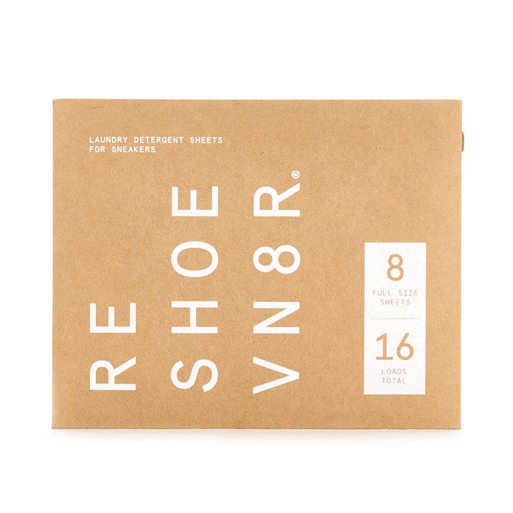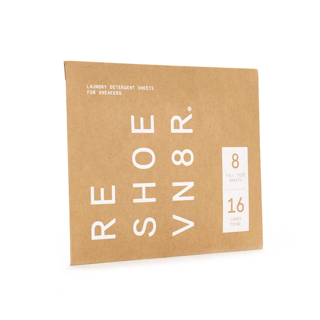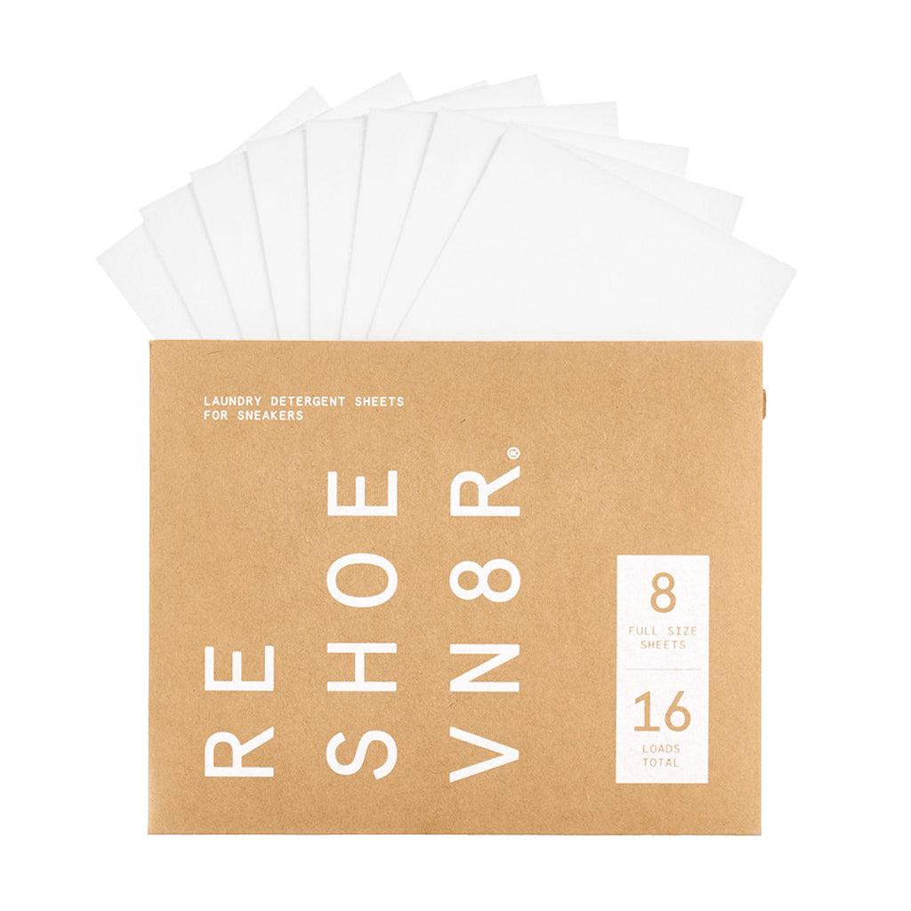 RESHOEVN8R Sneaker Laundry Sheets are a compact solution for deep cleaning your sneakers in the washing machine. Each sheet is perforated down the center, just tear in half, and drop in the wash. Each half sheet is strong enough to clean up to three pairs of shoes.