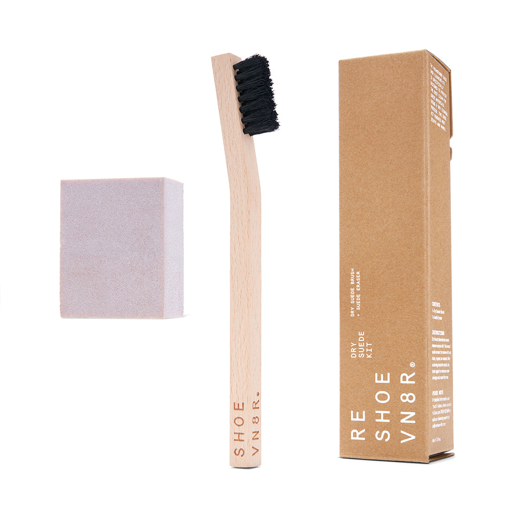 The RESHOEVN8R Dry Suede Kit is designed to provide an effective and gentle clean for your suede/delicate shoes. Use the Suede Eraser to lift the stains away, then use the Suede Brush to reset the nap of the suede.