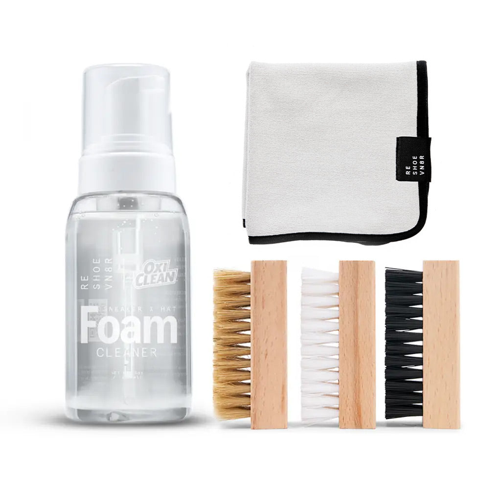 The RESHOEVN8R x OxiClean Foam Cleaning Bundle is your all-in-one solution for fast, effective sneaker and hat care. The ready to use pump action foam cleaner tackles dirt and grime on mesh, knit, suede, canvas, and more. While the variety of three included brushes give you the right tool for every material. Use the bowl to rinse your brushes between scrubs. After cleaning, place the brushes in the built in rack to air dry. When you're done, snap together for easy storage. The supplied Premium Microfiber Towel is excellent for drying your shoes and wiping off excess suds.